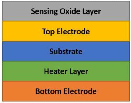Wang et al. [] researched on vanadium (V) doped SnO2 gas sensors and investigated the role of V doping on the sensitivity of tin oxide. The operation of this sensor follows two main mechanisms: (1) Oxygen activation-CO oxidation and (2) Adsorption-Desorption where both depend on the role of vanadium redox pairs and oxygen vacancies. Researchers fabricated the V-SnO2 nanoparticles using the co-precipitation method and characterized the crystallinity through XRD (X-ray diffraction) and FTIR (Fourier-transform infrared spectroscopy) techniques. They found that greater vanadium doping made the sensor less crystalline. They used Au electrodes and RuO2 heater during measurements (for a layered structure, shown in Figure 13). Experiments showed that resistance increased with the increase of oxygen concentration, which demonstrated the oxygen adsorption and n-type behavior of V-SnO2 sensors. The sensor response (Ra/Rg) according to time, temperature and concentration were reported for five different doping ratios (V/Sn = 0, 0.05, 0.1, 0.15, 0.2). The sensor with 0.05 V/Sn ratio had the highest sensitivity towards CO gas at 175 °C, which was identified as an optimum ratio in this approach. Stability experiments, conducted over a period of 72 h continuously, indicated that V-SnO2 sensor was very stable.