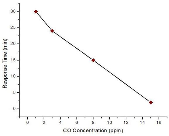 Response time of TiO2 (calcination temperature 600 °C) to 1–15 ppm CO gas at 200 °C.