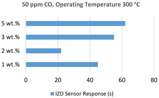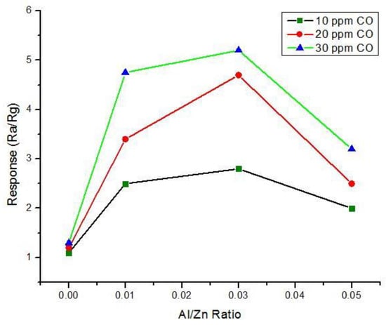 Chang et al. [] investigated Aluminum (Al) doped ZnO thin films. 2 wt.% Al:ZnO (AZO) films having four different thicknesses (65, 188.5, 280 and 390 nm) were prepared via the RF sputtering process on SiO2/Si substrates. They found that the sensitivity of this sensor for 1000 ppm CO was decreased with the increase of its thickness and the optimum operating temperature was to be 400 °C. The response time was found to be very fast for low thickness values. In another recent research on AZO based CO sensor, Hjiri et al. [] observed that Al doped ZnO nanoparticles displayed very high sensitivity and fast response to lower ppm of CO concentrations. They constructed AZO nanoparticles via the sol-gel method using four different Al/Zn ratios (0, 0.01, 0.03 and 0.05) for getting the optimum doping concentration. The authors reported that the resistance decreased with decreasing Al concentration. At 300 °C, the response of Al/Zn-0.03 was better than in for other ratios at 0–80 ppm CO gas concentrations (see Figure 17). At low temperatures <300 °C, Al/Zn-0.01 provided the better results. Al/Zn-0.03 also offered very fast and higher response compared to NO2.