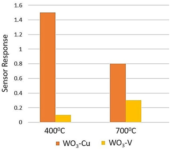 - Jimenez, I.; Vilà, A.M.; Calveras, A.C.; Morante, J.R. Gas-sensing properties of catalytically modified WO/sub 3/with copper and vanadium for NH/sub 3/detection. IEEE Sens. J. 2005, 5, 385–391. [Google Scholar] [CrossRef]