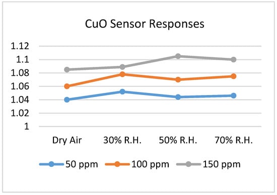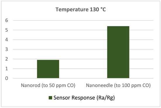 Carbon monoxide sensing at room temperature was researched by Manjula et al. []. The authors fabricated hydrothermally synthesized Au/SnO2 to achieve better sensitivity and selectivity in sensing of CO gas. The sensor response was evaluated via resistance measurements at varying temperatures and for different doping concentrations (0.5 to 2 wt.%). They found that highest response for 1.5 wt.% Au. Moreover, the sensor response of 1.5 wt.% Au/SnO2 was analyzed for different CO gas concentrations (up to 500 ppm) and different relative humidity (55% and 70%) values. It was found that the response was very fast and stable for 1.5 wt.% at room temperature for 500 ppm CO gas. However, no effect of humidity on this sensor response was found. The selectivity of this sensor was investigated for CO along with other gases as illustrated in Figure 12, where all the gases had 10% concentration in the air.