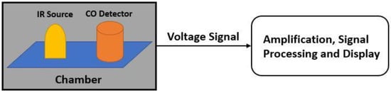 As a colorless, odorless, and tasteless gas, carbon monoxide is very harmful to human health as it can lead to death. Because humans cannot detect it directly, it is imperative to develop effective and cost-efficient smart sensing systems that can detect, and measure CO. Both natural and artificial sources can create carbon monoxide gas. The highest amount of exposure usually happens indoors, in places, such as garages, kitchens, etc. CO is generated during combustion that takes place in combustion engines, stoves, water heaters, generators, lanterns, and gas ranges or during burning charcoal and wood []. Acute exposure to carbon monoxide poisoning can result from any fossil fuel being burned. Long-term CO exposure can also result from constant exposure to automotive exhaust, smoke, and industrial sources (foundries, mills etc.) [,,,,].
