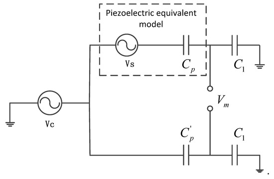It can be seen from the figure that even if the difference between the capacitance and actual capacitance of the piezoelectric material is small, a substantial interference voltage will be produced at the measuring end when the peak value of the driving voltage is large. The interference voltage is so great that is possible to exceed the allowable value of the measuring circuit, so that a bridge circuit based on capacitance matching is limited by the capacitance deviation. To suppress the interference caused by a capacitance mismatch, in this study, the original self-sensing piezoelectric bridge is improved.
