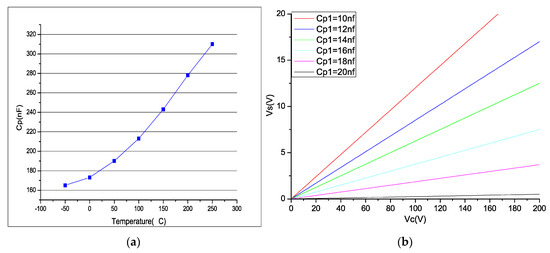Figure 2a shows the relationship with the capacitance and temperature of the PZT 5A material (70 × 10 × 0.1 mm³), which indicates the sensitivity to the temperature variation. Since the driving voltage is often several orders of magnitude larger than the induced voltage, even a small capacitance mismatch will have a greater impact on the output error. In this study, the capacitance of the MFC piezoelectric patch is 15.5 nF and = 50 nF. Figure 2b shows the variation curve of the measurement error voltage peak with the capacitance mismatch.