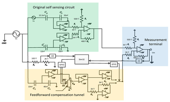 As shown in Figure 3, a feedforward tunnel was added to the traditional capacitance matching bridge. The output voltage of the feedforward channel is proportional to the driving voltage, and the gain of the tunnel is regulated by the digital potentiometer. According to Equation (2), the disturbance signal caused by capacitance mismatch is also directly proportional to the driving voltage, so that there is an optimal gain to eliminate the error signal completely.