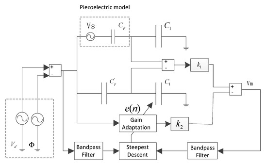 For practical implementation of self-sensing, the piezoelectric capacitance must be compensated in real time. The output voltage will reflect the sensing voltage only if the condition is satisfied. The adaptive compensatory mechanism that is shown in Figure 4 performs an online modification of the gain of compensation tunnel and uses an adaptive algorithm to dynamically drive the error to minimum. For this, a low-power persistent excitation signal , which is at a different frequency from the control voltage , is used as the test signal. The low power ensures that the voltage signals do not induce a moment in the piezoelectric actuator, and hence do not set the structure into vibration. Then, a bandpass filter is utilized to filter out the driven voltage in the process of adaptive iteration.