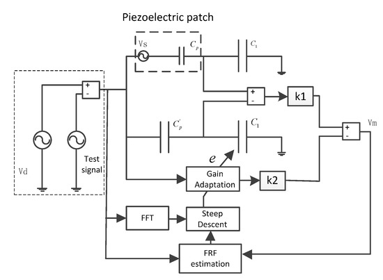 The block diagram of the frequency domain steepest descent algorithm is shown in Figure 5; the driving voltage and measurement signal are acquired to estimate the frequency response function, and the measurement signal is transformed to the frequency domain by FFT (Fast Fourier Transformation). Then, the potentiometer gain is adapted by Equation (16).