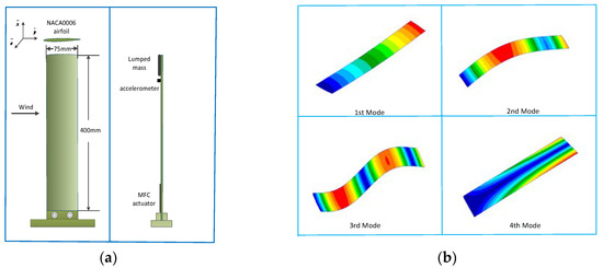 A wing model was designed to verify the control algorithm in a wind tunnel test. The wing model was made of elastic plastic with an elastic modulus of 1.1 Gpa, a density of 1430 kg/m3, and a Poisson ratio of 0.39. The cross-section of the wing model was NACA0006 and the max thickness was 6% of the chord length. A lumped mass of 36 grams was mounted on the tip of the wing as the counterweight in the wind tunnel test. Table 1 shows the modal parameter of the wing model. The wing root was vertically fixed on the base of the closed wind tunnel. The configuration of the actuator and sensor is shown in Figure 6a. MFC (Macro Fiber Composite) was adhered to the root of the wing model as the control actuator, and an accelerometer was mounted on the tip of the wing as the monitoring signal. Figure 6b shows the mode shape of the wing model.
