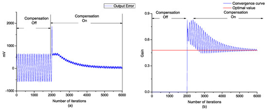 The offline sinusoidal driving voltage was determined by 2 V and 10 Hz, and the iterative step length of the steepest gradient was 0.0002. It can be seen that the final value of the digital potentiometer gradually converged to the ideal value after iteration, and the error curve tended to the minimum, as shown in Figure 7.