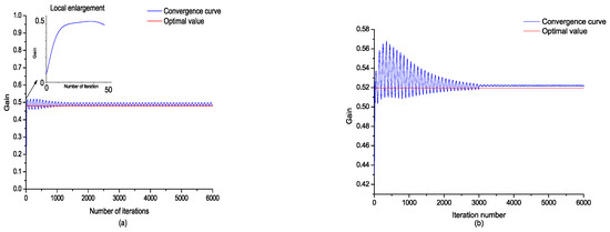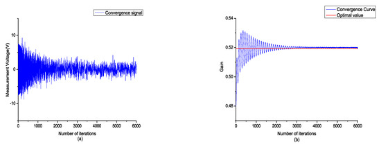 (a) Time domain steepest descent (TDSD) convergence curve of the measurement signal; (b) TDSD convergence curve of the positioner gain.
