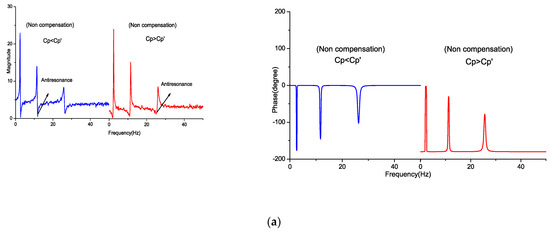 The frequency response function from the driving signal to the sensing signal was taken, which determined the balance of the bridge circuit and local strain. When the value of matching capacitance varied, the induced effect was reflected on FRFs. With the change in , variation in the resonance and antiresonance locations of FRF can be observed. When the capacitance value of was less than , the antiresonance occurred prior to the resonance, and the contrary occurred when was greater than . Furthermore, since the driving voltage and local strain were added to the measurement signal, it can be observed that the magnitude of FRF moved upward compared to the matching capacitance. With the feedforward compensation, the antiresonance and magnitude bias were eliminated in FRF. Figure 9 shows FRF comparison with no compensation and after compensating.