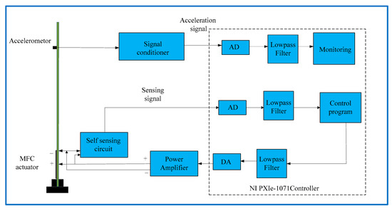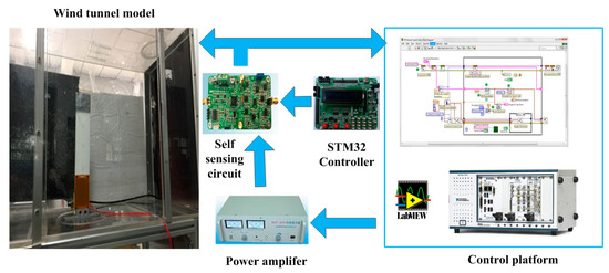 The control system configuration is shown in Figure 12. The self-sensing circuit was connected with an MFC to provide the driving voltage and obtain the sensing signal. The control and monitoring programmer was implemented in the embedded controller and programmed by LabVIEW. The control output signal was calculated and applied to the MFC actuator through a power amplifier. The vibration signal was acquired by the acceleration signal to monitor the performance of the control. The flutter controller was designed by the state-space model under wind speed 27 m/s, and sampling time was 0.002 s.