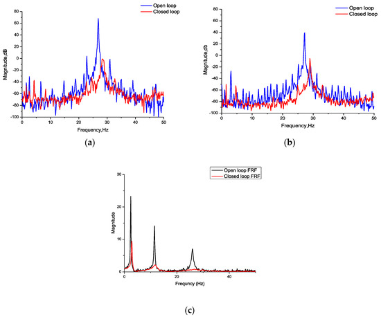 (a) Power spectrum of the self-sensing signal; (b) power spectrum of the acceleration signal; (c) comparison between the frequency response function (FRF) of the open loop and the closed loop.