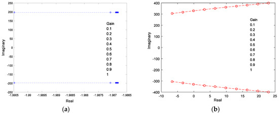 Root locus of closed loop system vs. feedforward gain. (a) Root locus of conjugated pole 1; (b) Root locus of conjugated pole 2