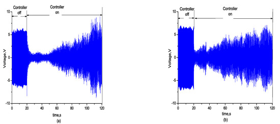 To validate the effect of control performance under the condition with capacitance mismatch and local sensing, the control effects were compared under the capacitance mismatching conditions of 12 nf, with no compensation for local strain. Results shown in Figure 17 indicate that the feedforward gain led to the instability of the closed-loop system and the flutter signal diverged.