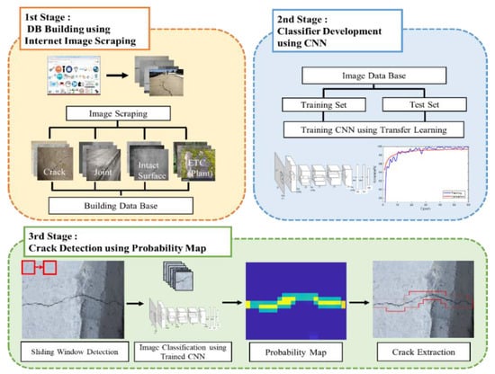 Contributions to the abovementioned literature are made in each step. In the first step, the Internet-based collection improves the collection of images taken under diverse structural, environmental, and photographing conditions and enables easy classification of collected images based on search keywords. In the second step, a transfer learning approach has been introduced to save time and cost involved in developing a deep learning model. In the third step, the probability map is introduced based on the last softmax output and overlapped searching to make the searching process robust. The whole procedure of the proposed method has been validated for the images of a building captured using a camera and a video of a concrete retaining wall recorded using a drone.