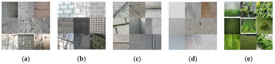 Image examples of the five classes are displayed in Figure 4. The images of various types of concrete cracks from macro to microcracks are categorized into Crack class (Figure 4a). The images containing multiple construction joints and joints between concrete tiles are categorized into Joint/Edge (ML) class (Figure 4b), and those that have one line or two lines at most into the Joint/Edge (SL) class (Figure 4c). To cover various types of real-world concrete surfaces, concrete surface images involving diverse texture and different colors are categorized into the Intact Surface class (Figure 4d). Finally, the images of moss-like plants which can be found on concrete surfaces are categorized into the Plant class (Figure 4e). This detailed categorization of images contributes to the high accuracy of the trained CNN model in detecting concrete cracks.