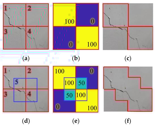 In this study, a probability map with an overlapped window sliding strategy is developed to overcome this issue. The test image is scanned using an overlapped window, and the probability map is obtained using the average softmax layer value of Crack class scanned by a sliding window with overlapping. Using this strategy, a crack object near the border of a window is located near the center of an overlapped window. Figure 5d shows an example of the addition of a 50% overlapped window to Figure 5a, and Figure 5e shows that the probability of the disregarded part of the crack in the detection result without overlapped windows was increased from 0% to 50%. By highlighting the pixels whose probability exceeds a predetermined threshold, 50% in this case, crack parts in the image can be extracted. The extracted crack parts in Figure 5f are more valid compared to the result of Figure 5c. The window sliding strategy may be changed according to the image size, allowable computing time, and target accuracy. Note that a window scans a test image twice with a quarter overlapping of the image as shown in Figure 5e in this study.