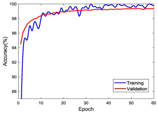 In this study, a personal computer (PC) with a single GPU (CPU: Intel(R) Core(TM) i3-6100, RAM: 8192 MB, GPU: NVIDIA Geforce 1060 3 GB) was used for the training with the help of transfer learning. The number of training images was increased to 10,000 for each class (i.e., a total of 50,000) by taking image augmentation techniques. Figure 7 shows the accuracy of training and validation as epochs proceed. To update the parameters using a stochastic gradient descent algorithm, the network takes a subset of the image data set, called a “mini-batch”, for each iteration. Once the network completes its pass through the full training set, it completes one epoch. The training accuracy is calculated based on 40,000 images, and validation based on 10,000 images not included in the training set. The highest accuracies in the training are 100.00% at several epochs and 99.39% at the 51st epoch in the validation. Despite the computer with relatively low computational power, the training during 60 epochs took 316 min since the training started from the parameters of the pretrained AlexNet. The result that the accuracy of validation reached 98% at 8th epoch shows the efficiency of transfer learning. For the sake of analysis, the CNN classifier was trained for 60 epochs even though the validation accuracy reached 99% at the 22nd epoch. This result confirmed that transfer learning is very effective in saving the training time, while the issue of overfitting does not arise.