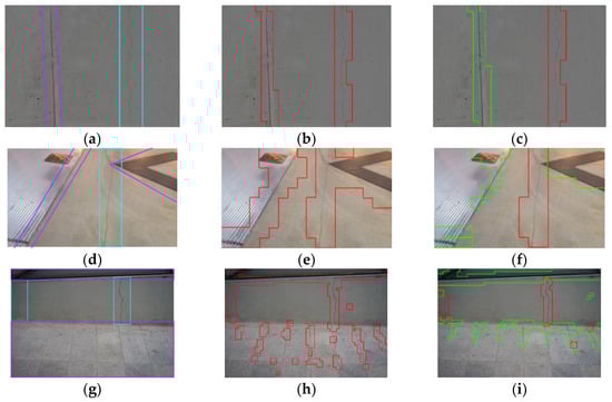 Figure 8 illustrates the enhancement obtained by introducing multiple classes to consider the confusing linear-shaped objects. Figure 8a,d,g shows three examples that contains both cracks and confusing objects, which are a joint in Figure 8a, objects with linear edges in Figure 8d, and linear concrete edges and rectangular tiles in Figure 8g. In the images, cracks are marked with cyan boxes and the confusing objects are marked with purple boxes. Figure 8b,e,h is the classification results of three images when two classes, Cracks and Surfaces, are considered. As presented in red boxes, the confusing objects are misclassified as cracks, since their shapes are closer to cracks than surfaces. Figure 8c,f,i is the enhanced results when multiple classes are used. The highlighted part with green boxes shows the confusing objects are classified as the Joint/Edge (SL) class, and they have high agreement with the misclassified parts as cracks in Figure 9b,e,h. The average precision of the three images increased from 32.72% to 97.93% while the average recall slightly decreased from 100% to 98.93%. Thus, by separating the confusing objects from real cracks, the false positives can be minimized in the practical environments.
