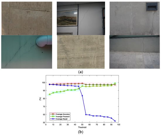 The threshold to determine cracks on the probability map may vary according to inspection purposes. In cases where precision is more important than recall, the threshold has to be relatively high, and vice versa. Mostly, recall is more valuable in the inspection of civil engineering structures, in order not to miss any possible source of failure. In this study, a parametric study to determine the proper threshold was conducted with six images obtained in diverse structural and photographing conditions as shown in Figure 9a. Three performance measures (e.g., accuracy, precision, and recall) were obtained by increasing the threshold on the six images as: