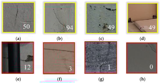 Example images of FP groups (a–d), FN groups (e–h) and their crack probabilities (a–d): (a) crack-shaped contaminants; (b) overlaid cement paste; (c) continuously distributed concrete pores; and (d) edge of linear-shaped construction material; (e) crack hidden behind object; (f) crack having straight line; (g) crack obscured by dark surface; and (h) crack on the corner of detecting window.
