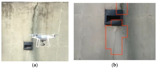 The test video was taken at a concrete retaining wall located at the University of Seoul as shown in Figure 12. The wall has a varying height between 2 and 4 m, and a width of approximately 20 m. A region of 2 × 5 m was inspected using a drone, and 16 cracks were found visually with varying shapes and sizes. The wall is highly contaminated with sediments by leakage, and it attaches several pieces of rectangular sidewalk lighting equipment that initiate the cracks as in Figure 12.