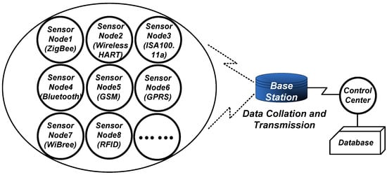 The wireless sensor network is an enabling technology of the internet of things and has emerged in recent decades. A complete wireless sensor network (WSN) system consists of many randomly deployed sensor nodes, a base station (or sink), a control center and a database, as illustrated in Figure 1. Various types of sensor nodes gather information about physical objects or environmental conditions, including the surrounding temperature, humidity, moisture, water flow and so on. The base station controls these sensor nodes and acts as a gateway to transmit the gathered data back to the control center. Although the use of sensor nodes in a WSN is currently limited to the fixed industrial-scientific-medical (ISM) band, they are perfectly able to conform with the developing trend of the internet of things (IoT) where any sensor node can communicate with the base station employing any wireless protocol. For instance, in a target monitoring field, it would be meaningful if sensor node 1 and sensor node 4 could utilize ZigBee and Bluetooth protocols separately to make contact with the base station, as presented in Figure 1. As WSN and IoT markets are growing rapidly, this multiple-communication-techniques scenario will be ubiquitous in the future.
