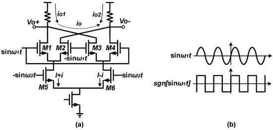 Mixers can be divided into active mixers and passive mixers. The former feature good isolation and better gain, while the latter are characterized by superior linearity. Because of the unacceptable switch loss and gain attenuation of passive mixers at high frequencies, the mixers utilized in FS are usually based on active mixers. A typical double-balanced active mixer is presented in Figure 2a. The transistors M1–M4 work as switches, and M5–M6 work as a transconductance pair. If the amplitude of the LO signal is large enough, M1–M4 can be regarded as ideal switches. When the LO signal sinω1t is in positive cycle, M1/M4 turn on and M2/M3 turn off, yielding a small-signal differential output current of 2i. Conversely, the output current is −2i when the LO signal is in negative cycle. In other words, the output current direction switches periodically according to the polarity of the LO signal sinω1t. Therefore, the differential output current can be written as