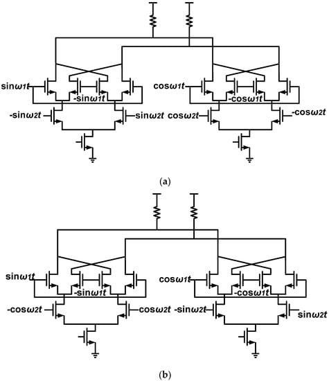 It can be observed that the output current contains double side-band components such as ω2 – ω1, ω2 + ω1 and so on. A single side-band (SSB) mixer is composed of two double-balanced mixers that share the same loads, as presented in Figure 3a. The output current of the left mixer is given in Equation (3) and that of the right mixer is ,so the total output current is