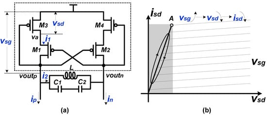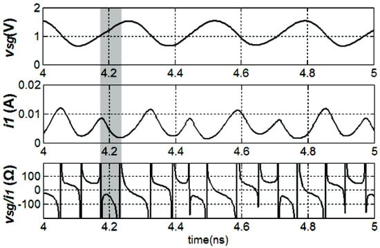 In order to release the contradiction between the selectivity and the working range of the conventional LC resonant load, we proposed a novel LC resonant load. The proposed load structure is illustrated in Figure 5a. Given that the circuit is symmetrical, we only analyze the half circuit for simplicity. If the amplitude of the output signal is small and the circuit is biased properly, the M3 works at the triode region or the saturate region. As the amplitude increases, or as increases, the M3 could be forced to work at the deep-triode region periodically. In this deep-triode region, with decreasing, the and increase accordingly, yielding a decreased source-to-drain voltage . As illustrated in the gray region in Figure 5b, the decreased is accompanied by the decreased . In other words, with increasing, the source-to-drain current decreases, resulting in a negative resistance. The transient simulation results of , , and are presented in Figure 6, and the negative resistance is depicted in the gray region. This negative resistance is performed only when the output amplitude is large enough and would not be presented if the output amplitude is small. Compared to a mixer utilizing a conventional negative-Gm pair, a mixer adopting the proposed PNR-based load can reduce the risk of oscillation.