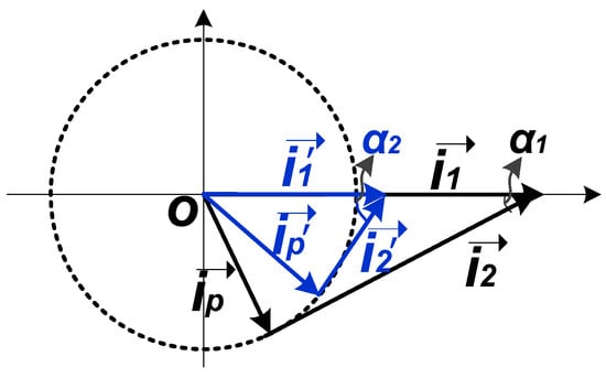 As long as the PNR is performed, the quality factor of the proposed load structure increases, resulting in a larger output impedance. For a mixer that is biased with a current source, the current in Figure 5a is usually fixed, and the amplitudes of and would increase as impedance increases, which in turn compels M3/M4 to work in the deep-triode region for a long time and produces larger than average PNR. This is a positive feedback that makes the output amplitude become larger and larger. Because M3 works in the deep-triode region for a long time and the average value of keeps decreasing, the amplitude of has to be decreased to maintain the vector relationship between , and , as illustrated in Figure 7. When PNR is not performed and is relatively large, the current is also large. Once PNR is performed, accompanied by a decreased average current , the current vector across the LC tank switches from to with a smaller amplitude. This is a negative feedback that maintains the balance of the output amplitude. In conclusion, the positive feedback produces large negative resistance and ensures high Q for superior selectivity, while the negative feedback guarantees the balance of the circuit.