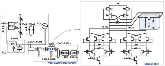 The proposed QSSB mixer in a wideband FS is presented in Figure 8. The FS is composed of a PLL and post synthesis circuit. The PLL is made up of a phase frequency detector (PFD), a charge pump (CP), an off-chip loop filter, an integrated VCO and a programmable multi-modulus divider (PMMD) and provides the differential outputs ranging from 3.2 to 4.8 GHz. The post synthesis circuit consists of the divide-by-2 dividers, the QSSB mixer, and the quadrature divider (QIDIV) and is fed by the differential VCO outputs. The first divide-by-2 divider is based on the conventional current-mode logic (CML) structure and gives the 1.6–2.4 GHz quadrature outputs, while the second one is a regenerative divider and realizes the function of the quadrature-in quadrature-out (QIQO). The outputs of the two dividers are delivered to the QSSB mixer to produce the 2.4–3.6 GHz quadrature outputs. By combining the two quadrature signal sources, the 1.6–3.6 GHz quadrature outputs are obtained. By sending the quadrature outputs into the QIDIV, that consists of 6 stages of divide-by-2 dividers, the output frequencies ranging from 30 M to 3.6 GHz are covered. Compared with a PLL utilizing multiple VCO cores and a set of dividers to produce the wideband outputs, the PLL in the proposed FS adopts only one VCO core with differential outputs covering 3.2–4.8 GHz, which reduces the loop parameters variation and is beneficial for optimization. Moreover, the PMMD in the PLL could work at a lower frequency and consume less power.