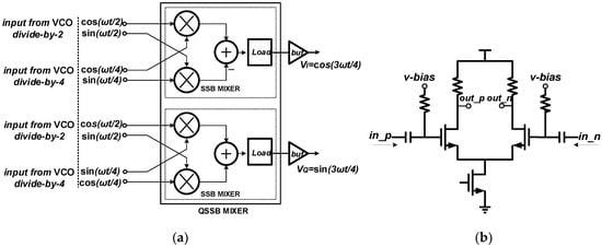 The QSSB mixer is composed of two identical SSB mixers and two output buffers. A 3-bit cap array is utilized to extend the operating range. Meanwhile, the source degeneration technique in LO ports is employed to further improve the linearity, splitting the RF ports into 8 devices. The QSSB mixer structure is presented in Figure 9a, with two input frequencies at and and an ideal output frequency at , where represents the VCO oscillating frequency. To avoid loading effects and provide better drive capability, output buffers are employed and the structure is presented in Figure 9b.