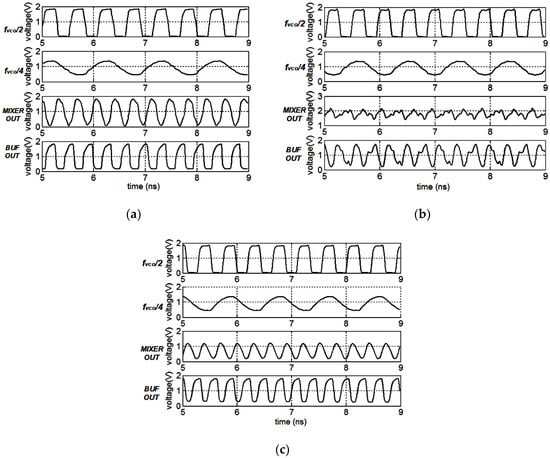 The transient simulation results of the mixer with fixed cap array control signals and different types of loads are presented in Figure 10a–c. The input frequency is set to be 4.4 GHz and the ideal output frequency is 3.3 GHz. The peak-to-peak voltage of the mixer outputs reach 1.8 V when the mixer adopts the Q-enhanced LC resonant loads, as presented in Figure 10a. After passing through the following buffer, the output amplitude does not appear to change. In fact, the mixer is injection locked under this condition. When employing the conventional LC resonant load, the mixer produces unclean signals because of the limited selectivity, and the transient outputs are presented in Figure 10b. The pure output signals are provided at the mixer output with an amplitude of about 0.5 V when utilizing the proposed load, as depicted in Figure 10c.