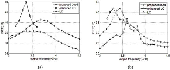 The ISRR versus the operating range at the mixer’s outputs and the buffer’s outputs are presented in Figure 11a,b respectively. For the two inputs and ,and the desired output locates at , the image side-band is , the same as one of the inputs. Thus, the input signals could degrade the ISRR directly by feedthrough or other side-effects. When employing the Q-enhanced LC resonant load, the mixer provides the best ISRR performance at the mixer’s outputs with the maximum value of about 50 dB at 3.375 GHz. However, the output frequency range is 3.15 G–3.6 GHz because of the injection locked phenomenon. The mixers adopting the LC resonant load and the proposed load perform over a wider operating range, and the ISRR performance of the former is superior for the absent utilization of nonlinearity components in the LC load. In reality, at the outputs of the mixer employing the LC resonant load, apart from the image side-band signal, some other side-band signals also exist because of the low Q LC tank, leading to the unclear transient outputs as presented in Figure 10b. The ISRR simulation results at the mixer’s outputs are presented in Figure 11a. At the buffer’s outputs, the ISRR of the mixer utilizing the LC or Q-enhanced LC resonant load deteriorates and that of the mixer adopting the proposed load improves from 3.2 G–3.6 GHz; the simulation results are depicted in Figure 11b. Compared with the mixer employing the conventional loads, the proposed one, adopting the PNR-based load, performs over a wider operating range and has a higher ISRR simultaneously.