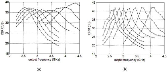 The overall ISRR simulation results at the mixer’s outputs and the buffer’s outputs by tuning the mixer cap-array are presented separately in Figure 12a,b. The output frequency range covers 2.25–4.5 GHz. At the mixer core outputs, the ISRR is 33–39.5 dB, and is 30–42 dB at the buffer outputs. In 2.4–3.6 GHz, the ISRR are 35.8–37.3 dB and 35.2–41.8 dB at the mixer core outputs and the buffer outputs, respectively.
