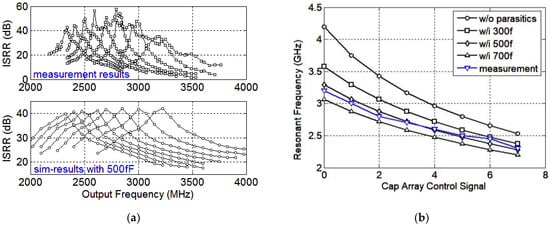 The output spectrum is presented in Figure 14. The two input signals are at 1872 MHz and 936 MHz with the power level of −55 dBm and −62.7 dBm, respectively. The desired tone is at 2808 MHz and the signal power is about −10.9 dBm, producing an ISRR of 51.8 dB. The total ISRR measurement results against the output frequency and the ISRR simulation results, with 500 fF parasitic capacitance, are presented in Figure 15a. It can be observed that the measured operating frequencies are smaller than those of the simulation results presented in Figure 12b, mainly due to the parasitic capacitors decreasing the LC resonating frequencies. When including the 500 fF parasitic capacitors, the resonating frequency simulation results are in accordance with the measurement results. The simulated and measurement resonant frequencies versus the mixer cap-array control signals are presented in Figure 15b. When the parasitic capacitance is set at 500 fF, the simulation results are consistent with the measurement results as shown in Figure 15a. The peak ISRR measurement result is about 57 dB and is larger than that of the simulation result. Furthermore, the measurement operating bandwidth of each curve is much smaller than the simulation result. Considering the conflict between Q and bandwidth, the measurement results imply that the measured quality factor of the implemented load is much higher than the simulation result. The ISRR performances are 40–57 dB and 30–57 dB across 2.5–3 GHz and 2.3–3.2 GHz, respectively. From 3–3.6 GHz, the ISRR drops off drastically, partially because the inverter buffer attenuates the high frequency signals. The inverter buffer delivers −5~0 dBm output power at 30 M–3 GHz while providing −5~−15 dBm at 3–3.6 GHz, implying the buffer attenuates 5–10 dB at 3–3.6 GHz. If the outputs locate at 3–3.6 GHz, the image side-band signals locate at 1–1.2 GHz. In this condition, the desired outputs are attenuated while the image side-band signals are not suppressed to the same extent, leading to the drop-off in the ISRR characteristic. In addition, the gain mismatch and phase imbalance of the VCO outputs can also degrade the ISRR performance. By optimizing the inverter buffer and compensating the gain and phase mismatch of the VCO outputs, the ISRR performance could be improved.