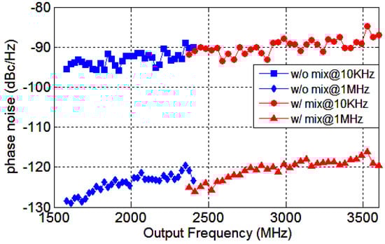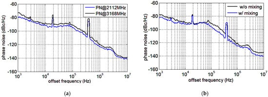 The phase noise measurement results at 2112 MHz and 3168 MHz are presented in Figure 16a, and the spot phase noise at 10 KHz and 1 MHz offsets are −92, −88 and −123, −120 dBc/Hz, respectively. The phase noise distinctions between 2112 MHz and 3168 MHz from 1 KHz to 10 MHz offsets are 3–4 dB. The output frequency 3168 MHz is produced by mixing 2112 MHz and its divide-by-2 output 1056 MHz. Therefore, the two signals originate from the same core synthesizer signal and the phase noise deviation is mainly caused by the QSSB mixer. Ideally, as frequency multiplied by a factor of 1.5, the phase noise would increase about dB, which is in accordance with the measurement results, indicating the noise contributed by the mixer is negligible. The spurs at 20 KHz and 400 KHz are caused by the interfering signals at the input. By employing a pure reference signal, these spurs can be eliminated. The desired VCO tuning range is 3.2–4.8 GHz. In fact, the measurement tuning range of the VCO is 2.5–5 GHz for an efficient frequency margin. Therefore, the target output frequency can be produced by mixing indirectly or by PLL directly. The phase noise measurement results at 2376 MHz, with or without the mixing process, are illustrated in Figure 16b. When directly output, the VCO oscillates at 4752 MHz and the target frequency is obtained by divide-by-2 operation. Otherwise, the VCO works at 3168 MHz and the desired frequency is generated by mixing. As can be seen, the phase noise of the outputs given indirectly is superior to that given directly. In fact, the phase noise of the core synthesizer signal at 3168 MHz is superior to that at 4752 MHz for the lower operating frequency. Although the mixer induces some noise, the output signal originating from 3168 MHz is purer than that from 4752 MHz. The QSSB mixer provides another option for low phase noise frequency synthesizer design.