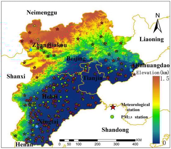 The study area is Hebei province, which has a spatial extent of 36°05′ to 42°40′ N latitude and 113°27′ to 119°50′ E longitude (Figure 1). Hebei is the only province in China with highlands, mountains, hills, basins, plains, grassland, and seashores and has a total area of 188,800 km2 and a permanent population of approximately 75 million. Hebei includes 11 cities, and the northernmost part of the province belongs to the Mongolian Plateau, with high altitudes; the southern part of the province comprises plains with a low altitude. Hebei has a temperate monsoon climate and is dry with little rain in winter. The air pressure is low, and the air does not flow. Hebei has important steel and coal sites in the north. The unfavorable climatic conditions and massive pollutant emissions of this province lead to poor air quality, so Hebei is one of the most polluted provinces in the China.