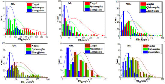 Histogram statistics of PM2.5 concentrations from Jan. to Jun. 2017 in Xingtai-Nanhe, Qinhuangdao-Changli, and Zhangjiakou-Huaian, respectively.