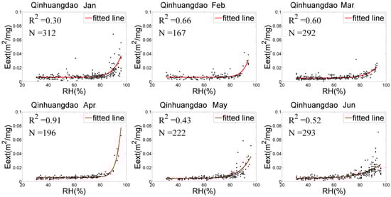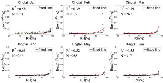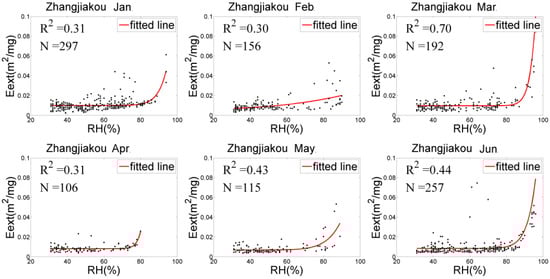 The relationships between and RH of the three stations were adequately fitted by Equation (5), as shown in Figure 3, Figure 4 and Figure 5. In general, grows slowly when RH is low and increases rapidly under higher RH. However, there were differences in RH among the three sites, showing the following: (1) The scatter distribution had the most concentrations and the best fitting ability at Xingtai-Nanhe, and the R2 was higher than 0.5 (except for in February). At Qinhuangdao-Changli, the fitting ability was the worst in January and the best in April (R2 of 0.3 and 0.9, respectively). The hygroscopic growth capacity was stronger at Qinhuangdao-Changli than at the other two sites because Qinhuangdao-Changli is close to the coast, the aerosol compositions of this coastal site contain salt particles, and the rapidly grows with RH when RH is more than 70%. The fitting result in Zhangjiakou-Huaian was not ideal, and the R2 was generally less than 0.5 in each month. (2) At Xingtai-Nanhe, the fitting curve from January to June was relatively flat when RH was less than 90% and increases slightly when RH was more than 90%, which shows that the capacity of hygroscopic growth was weak. Compared with the fitting curve of Xingtai-Nanhe, the Qinhuangdao-Changli curve increased more rapidly when RH exceeded 90%. The data from both March and May presented obvious hygroscopic behavior, and a deliquescent point with an RH of approximately 90% occurred in April, while a hygroscopic and deliquescent phenomenon occurred in January and June. At Zhangjiakou-Huaian, the humidographs from January to June had flat growths at a medium RH (40–80%), with sharp increases under high RH (>80%) in March and June, which shows that both hygroscopic and deliquescent behaviors occurred simultaneously. Therefore, there were significant differences in the physical and chemical characteristics of aerosols in the three regions. (3) There was little variation in the fitting curve of Xingtai-Nanhe, which indicates that the aerosol sources and environmental conditions in the area varied little from month to month. The capacity of hygroscopic growth had a high monthly variation at Qinhuangdao-Changli, indicating that the site experienced large environmental changes or had complex aerosol sources because of aerosol transmission from other areas. Although the existence of outliers within the fitting results can generate an uncertainty for humidity correction, the results were able to reflect the average variation of with RH. It is helpful to correct the influence of humidity to obtain near-surface particle concentrations.