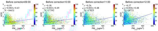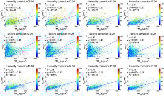 According to the matching data of the environmental monitoring stations and meteorological stations in Hebei province, vertical and humidity corrections were made to each site to estimate the PM2.5 concentrations. Both the scatterplots of PM2.5 vs. AOD and PM2.5 vs. the “dry” extinction coefficient () are shown in Figure 6 (colorbar indicates RH). The first and third rows represent the scatterplots between AHI AOD and PM2.5 from 09:00 to 16:00, and the second and fourth rows represent and PM2.5. The scatter distributions of AOD and PM2.5 are relatively discrete, and their correlations are low (the lowest r is 0.18 at 10:00, and the highest r is only 0.47 at 15:00). Compared to the poor correlation between AOD and PM2.5, a better, relatively high correlation was obtained by vertical-humidity correction between and PM2.5, with the hour correlation r increasing from 0.19–0.47 to 0.61–0.76.
