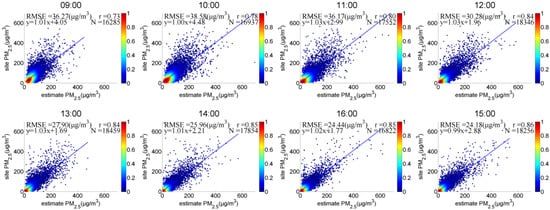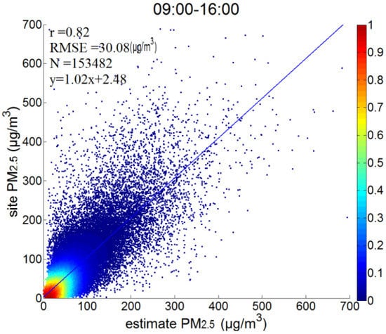 Figure 9 presents hourly daytime PM2.5 scatter plots from January to June 2017. The correlation increased from 09:00 to 16:00, and the r increased from 0.73 to 0.86, with the maximum (minimum) RMSE of 38.58 μg/m3 (24.18 μg/m3) at 10 a.m. (15 p.m.) and higher PM2.5 concentrations in morning than in afternoon, which might be attributed to the following two factors. (1) In the morning, the solar azimuth and water vapor level are relatively high, and sunlight reaches the ground after a longer path through the atmosphere, which can affect the accuracy of AOD retrieval. (2) The higher RH can cause deliquescent behaviour, which has an influence on the humidity correction. In June 2017, the correlation was relatively low, with r = 0.68, which might have occurred because the atmosphere was more active, with higher wind speeds and increases in rainfall. Consequently, the physical and chemical properties of particulates in local areas were more complex and varied greatly.