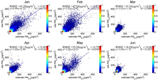 The relationship between the near-surface “dry” extinction coefficient and PM2.5 concentrations improved after vertical-humidity correction; therefore, the PM2.5 concentrations were calculated by Equation (6). The satellite-estimated PM2.5 and all ground-measured data from January to June 2017, in which there are a total of 153,482 points, are shown in Figure 7. According to the fitting results, the correlation was relatively high (r = 0.82), the root mean square error (RMSE) was 30.08 μg/m3, the slope was close to 1, and the intercept was 2.48. The accuracy of PM2.5 estimation was verified on a daily, monthly, and by site.