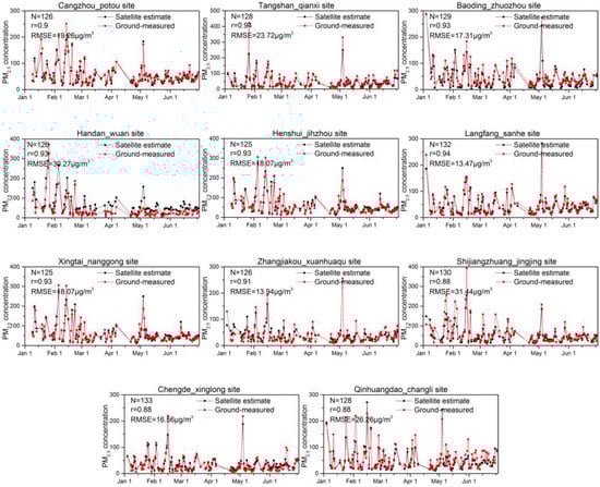 To evaluate the accuracy of the PM2.5 vertical-humidity correction at each site, we selected 11 sites from different cities in Hebei and respectively drew a time series diagram of the daily mean PM2.5 concentrations, as shown in Figure 10. According to the ground-measured PM2.5, in January and February 2017, there was “heavy” pollution weather (PM2.5 > 150 μg/m3) at Baoding, Changzhou, Handan, Hengshui, Xingtai, and Shijiazhuang, where the air quality was very poor. There were low PM2.5 concentrations at Zhangjiakou, Tangshan, and Chengde, where there were few pollutants from industry and vehicle emissions. At all sites, except for on 4, May 2017 (PM2.5 > 200 μg/m3), the mean daily PM2.5 concentrations from March to June were generally less than 100 μg/m3, which shows good air quality. The decrease in PM2.5 was mainly related to meteorological conditions and decreases in pollution from coal heating. According to Figure 11, the correlation between ground-measured PM2.5 and satellite estimation was relatively high overall. The r values were generally ±0.9, and the RMSEs were between 13.94 and 31.44 μg/m3. However, PM2.5 concentrations were overestimated (underestimated) when the PM2.5 concentrations was low (high). Interestingly, satellite estimation commonly underestimated the PM2.5 of Qinghuandao-Changli, as the PM2.5 of this site has complex physical and chemical characteristics, but the particle component were not considered in this paper, which may have a certain influence on the accuracy of PM2.5 estimation.