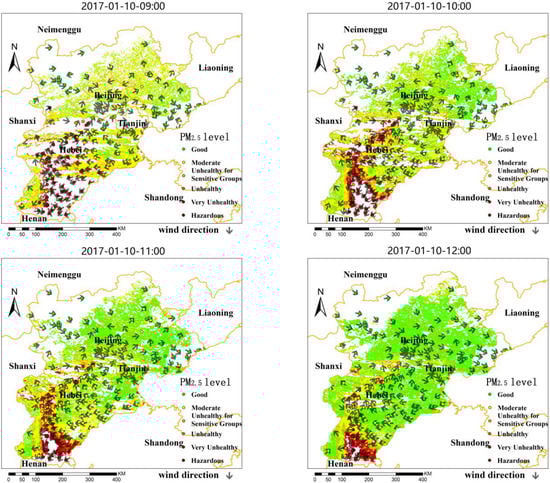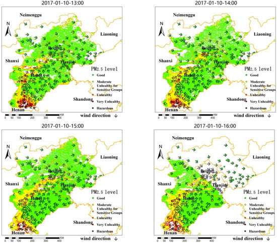 - The spatial distribution of PM2.5 concentrations from 09:00 to 16:00 is estimated for 10 January 2017, and the process of pollution accumulation and dissipation is clearly presented over space and time. This type of estimation is conducive to the evaluation and control of air quality.