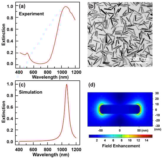 Figure 1b). From the TEM characterizations one can easily determine the length and diameter of the nanorods are 87.3 ± 14.3 nm and 11.9 ± 2.1 nm, respectively. As a result, the average aspect ratio of the nanorod is 7.9. According to the geometrical parameters provided by the TEM characterizations, we then perform numerical simulations on the electromagnetic responses of the large-aspect-ratio gold nanorod using the finite-difference time-domain (FDTD) method. As shown in