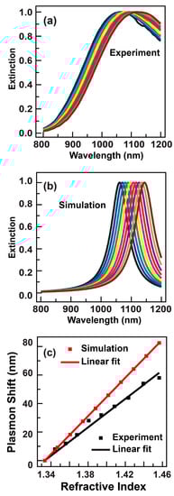 Figure 2b, the calculated plasmon peaks of the gold nanorods shift toward the red direction along with increase of the RI of the surrounding medium. In addition, the calculated plasmon shifts exhibit a linear dependence on the RI as well (