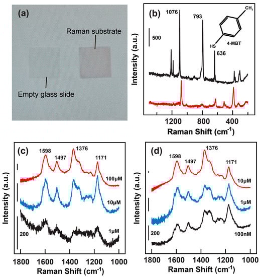 SERS is a very important sensing technique that is strongly related to the plasmon resonances of noble metal nanostructures. To demonstrate the SERS performance of the large-aspect-ratio gold nanorods, the nanorods were first immobilized onto the glass slide to form a SERS substrate using a wet-chemical procedure (see Materials and Methods). The photograph of the SERS substrate is given in